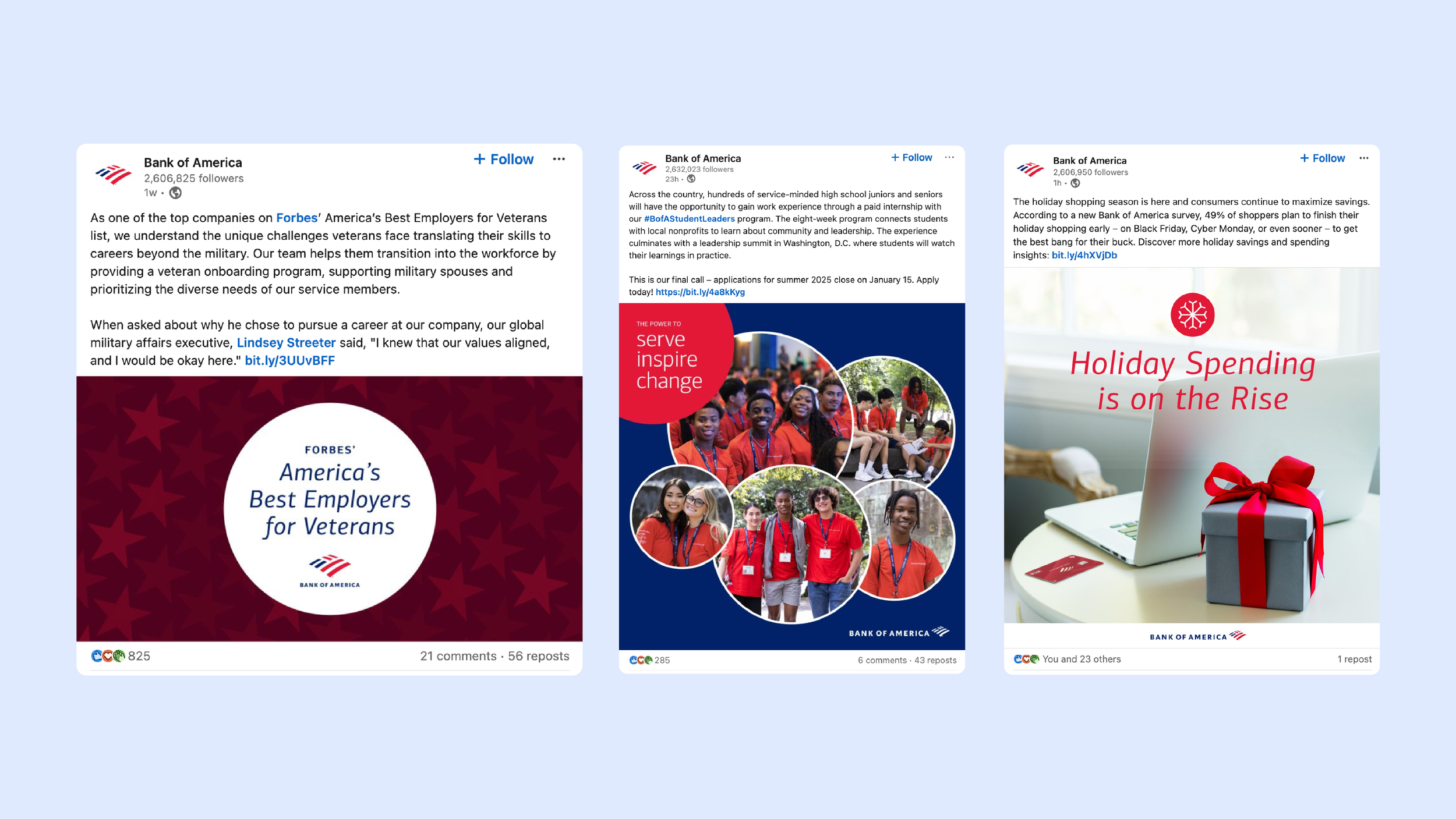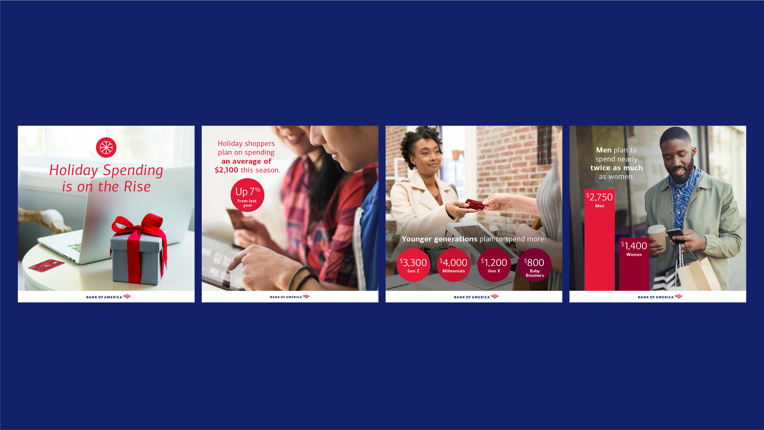 Bank of America is a leading financial institution, offering a full range of banking, investing, and financial risk management services. I support the brand through the design of social media graphics, infographics, and data-driven reports that communicate key messages and insights with clarity and consistency. Shown here is a selection of social media content highlighting major milestones, report data, and key internal initiatives.