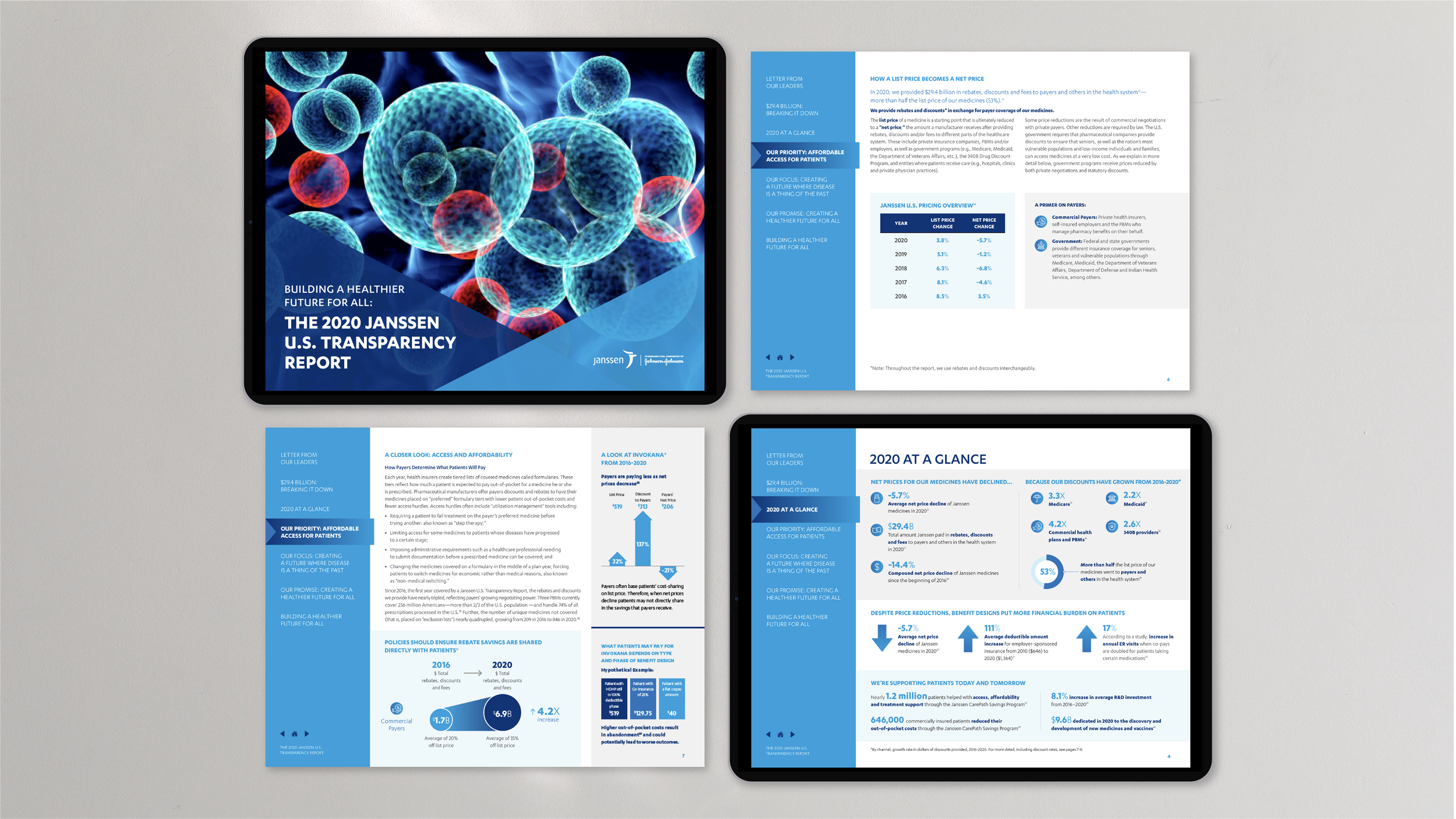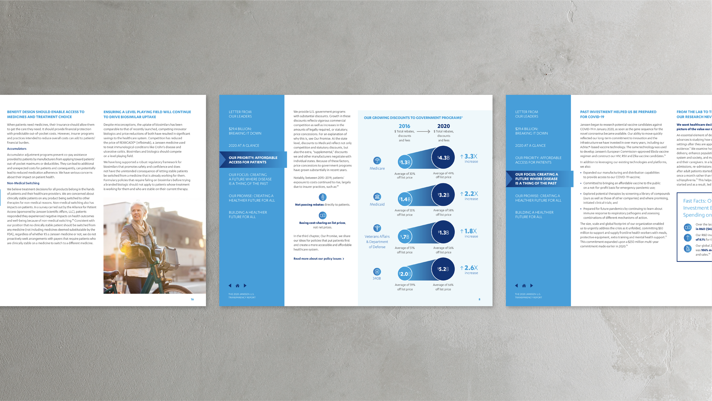 In previous years, the Janssen Transparency Report was long and text-heavy with minimal visuals. Following the tumultuous year of 2020, this was Janssen’s chance to refresh the report by clarifying their vision to patients and drive further progress in effort to create a more equitable healthcare system.